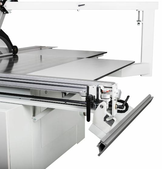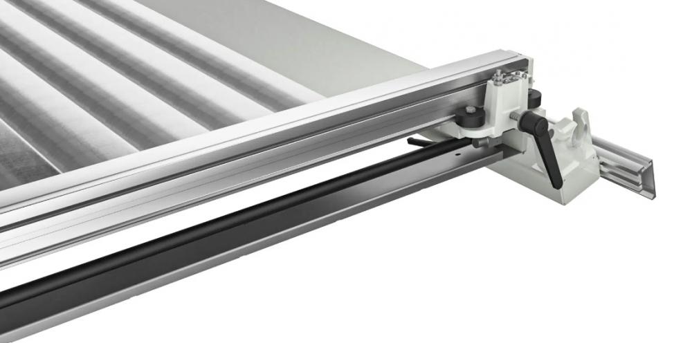 Ručne posúvaný paralelný doraz je súčasťou základnej výbavy všetkých našich formátovacích píl. Nastavenie podľa mierky a štandardne presné, jemné doladenie umožňuje presné rezy.